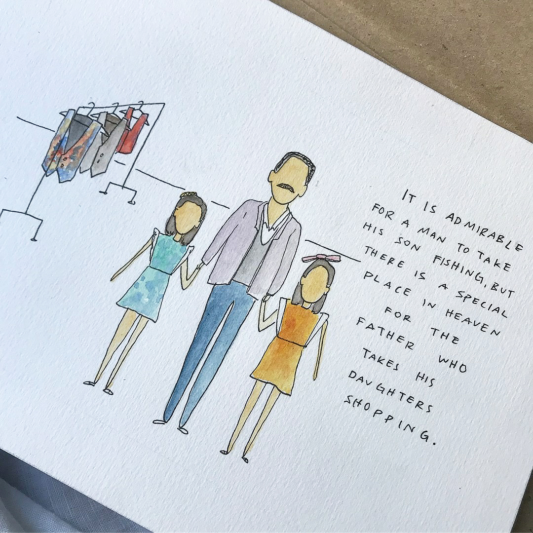 - Una tarjeta dibujada a mano de Un Detalle. Esta artista regia hace tarjetas y dibujos a petición del cliente. Tiene dos estilos, uno más real y el otro más caricatura. Tiene mucha creatividad y son padrísimas para dar como tarjetas o enmarcar. Mi papá tiene la suya colgada a un lado de su cama. Me fascina porque captó la escena perfecto.